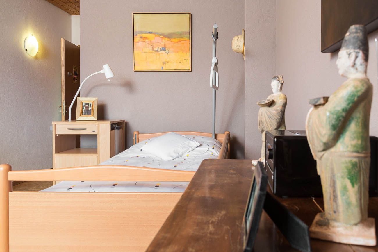 Chaque résidant est logé dans une chambre individuelle. Toutes les chambres bénéficient d’un téléphone, d’une prise de télévision, d’une sonnette d’appel ainsi que d’une salle de bains entièrement équipée: mains courantes, barres d’appui, sonnette d’appel. Le résidant est libre, s’il le désire, de meubler sa chambre à sa guise : il peut, s’il le souhaite, apporter ses meubles ou tableaux. Nous imposons toutefois le lit électrique et, pour des raisons de sécurité, l’absence de tapis de sol.